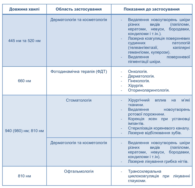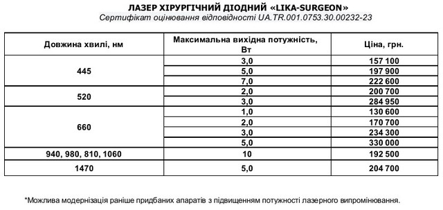 Лазер хірургічний діодний «LIKA-surgeon» виготовляється тільки з однієї довжини хвилі робочого лазерного випромінювання, на Ваш вибір із представлених у таблиці довжин хвиль (див. у фото апарата).